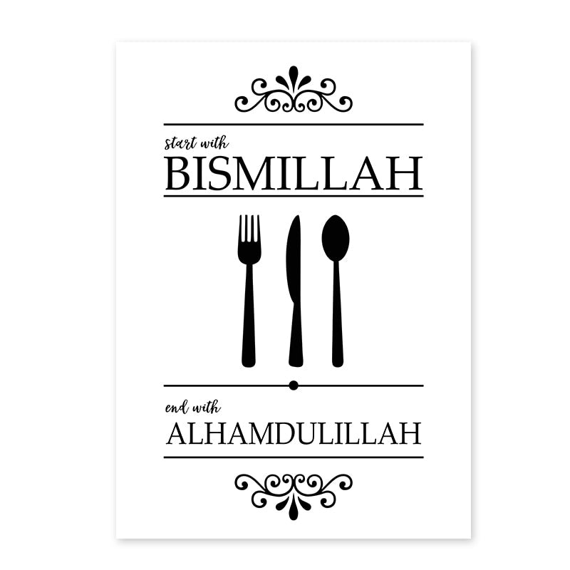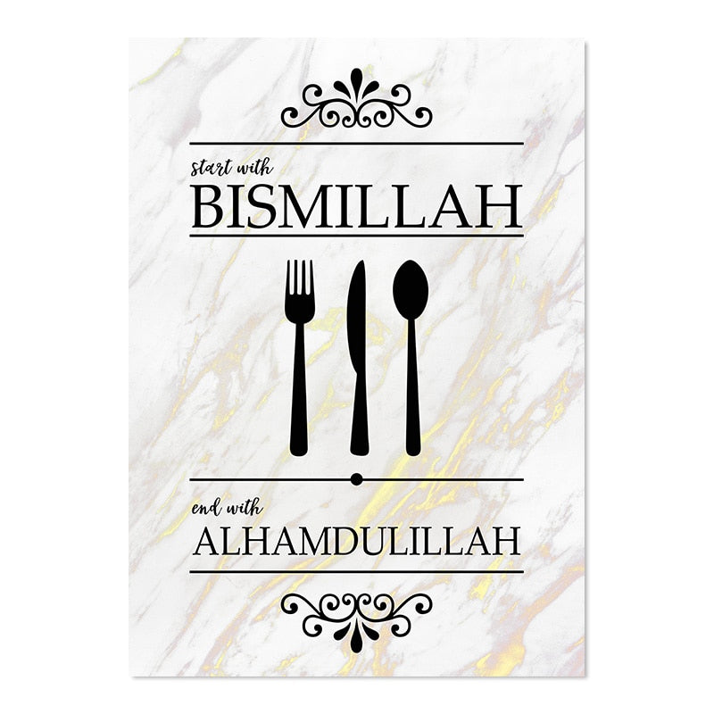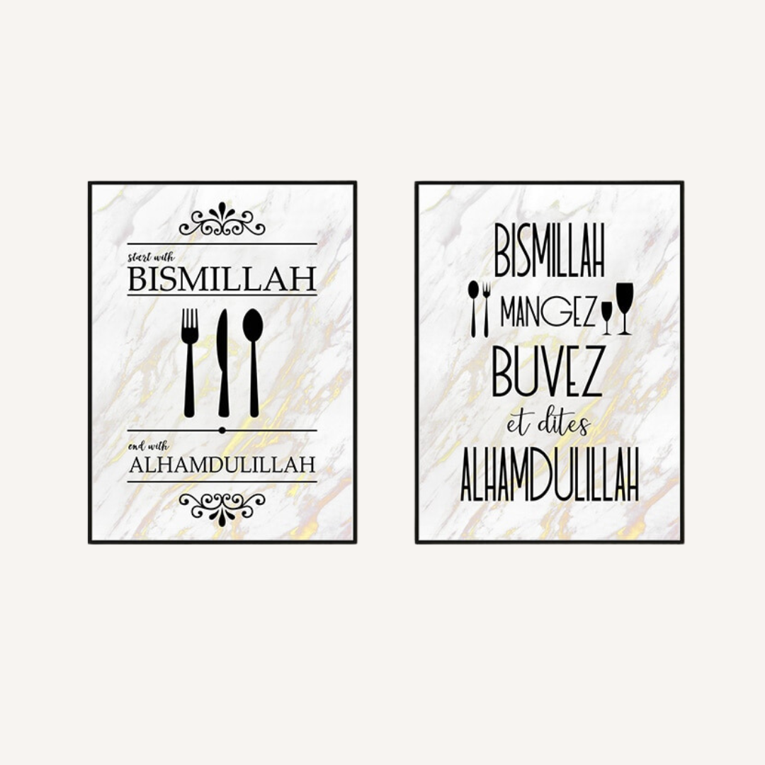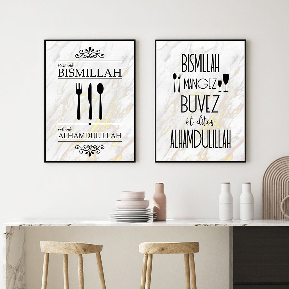 Chez Studio Créa Paris, nous sommes ravis de vous présenter notre collection d'affiches spécialement conçues pour la cuisine, rappelant les règles de bien-être et de gratitude. Nos affiches mettent en valeur les mots "Bismillah", et "Alhamdulillah" dans une superbe écriture noire, avec un fond blanc effet marbre doré.