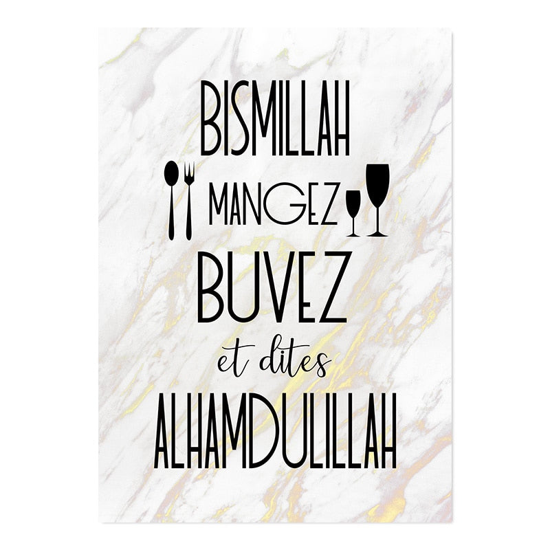 Commandez dès maintenant nos affiches "Bismillah Mangez Buvez Dites Alhamdulillah" et transformez votre cuisine en un espace harmonieux et inspirant. Les mots écrits avec élégance et le fond effet marbre doré ajouteront une touche de classe à votre décoration intérieure.