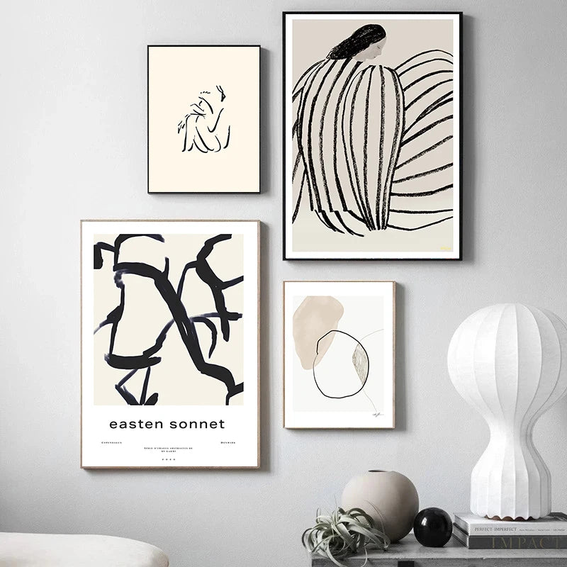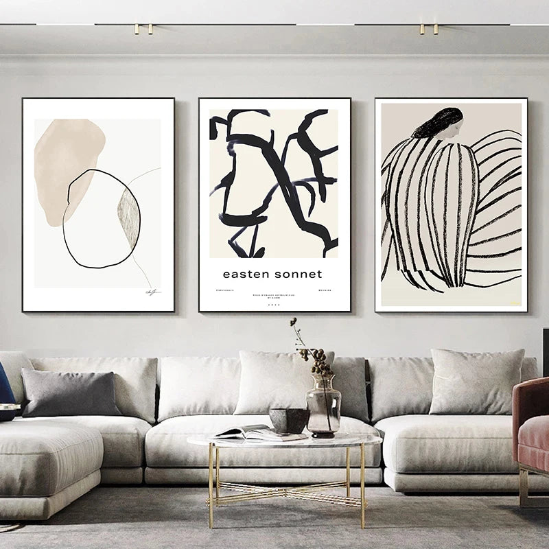 Découvrez cet ensemble d'affiches artistiques, alliant minimalisme et sophistication, idéal pour apporter une touche d'élégance contemporaine à n'importe quelle pièce de votre maison. Avec leurs nuances douces de beige, noir et blanc, ces œuvres sont parfaites pour créer une ambiance sereine et harmonieuse.
