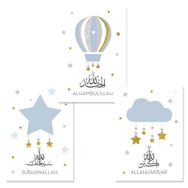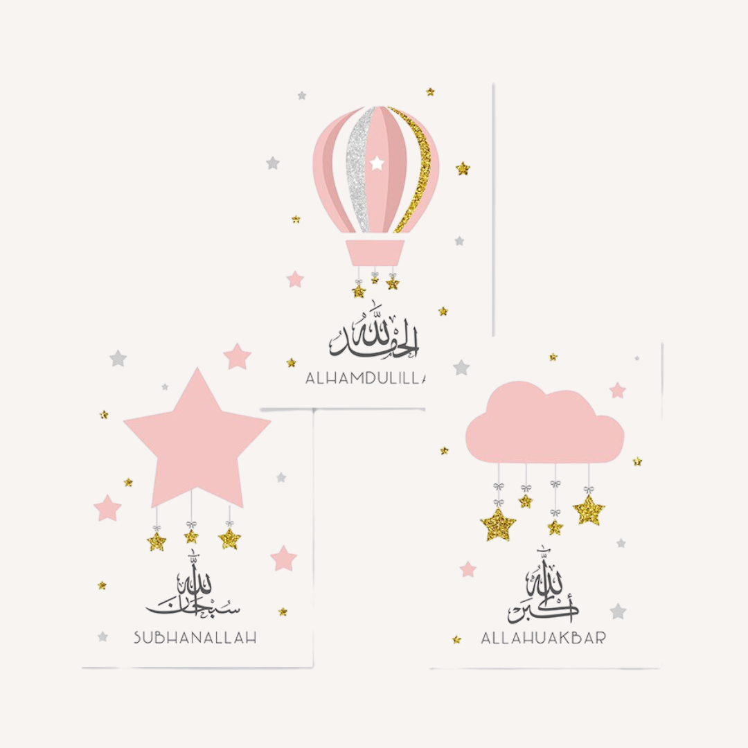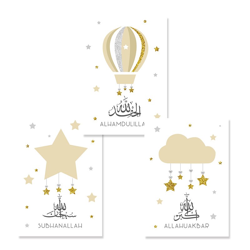 Une affiche avec écriture calligraphique "Al hamdu lillah ", "Suban Allah " & "Allahu Akbar" ♥️