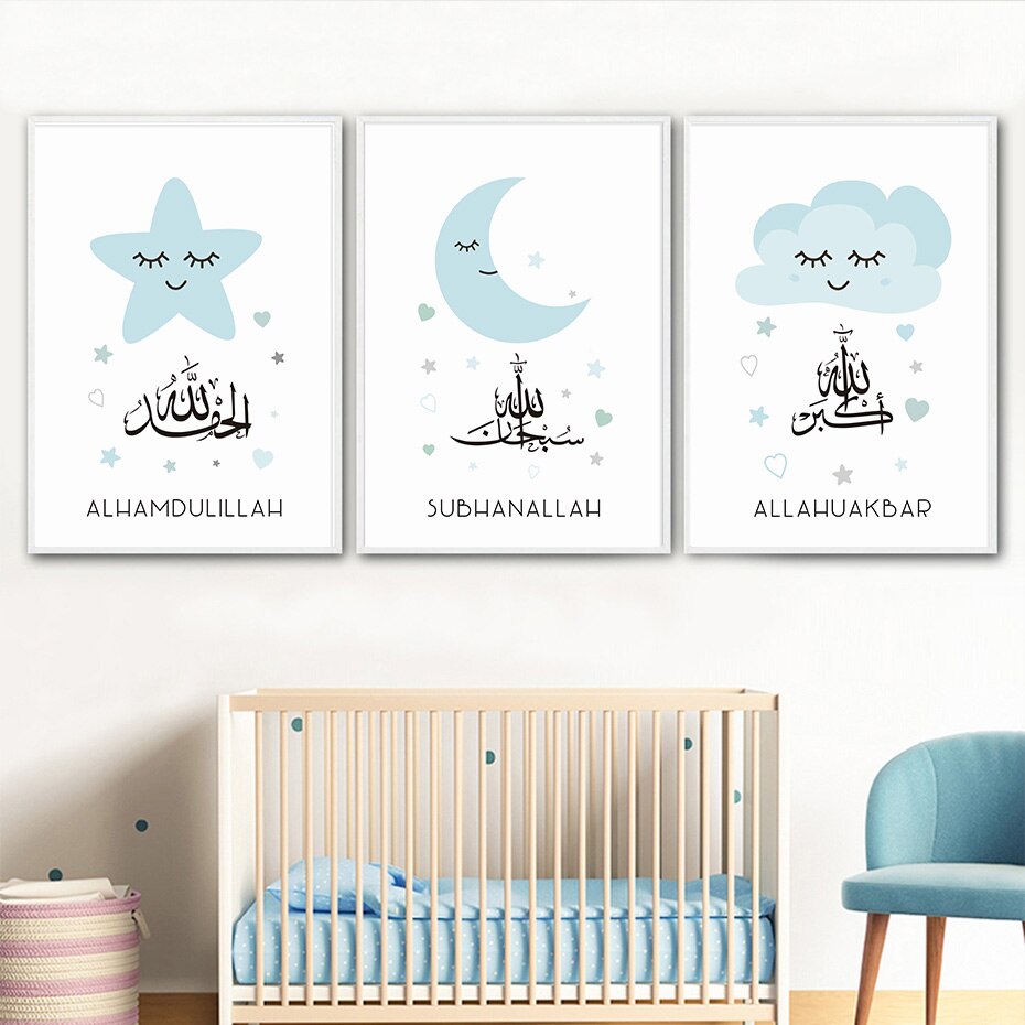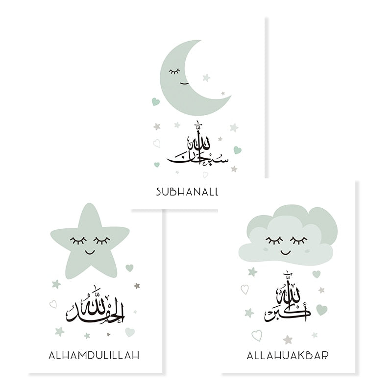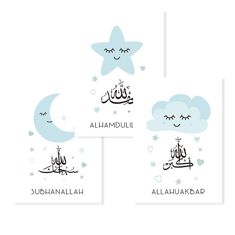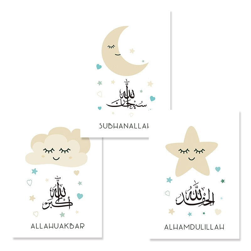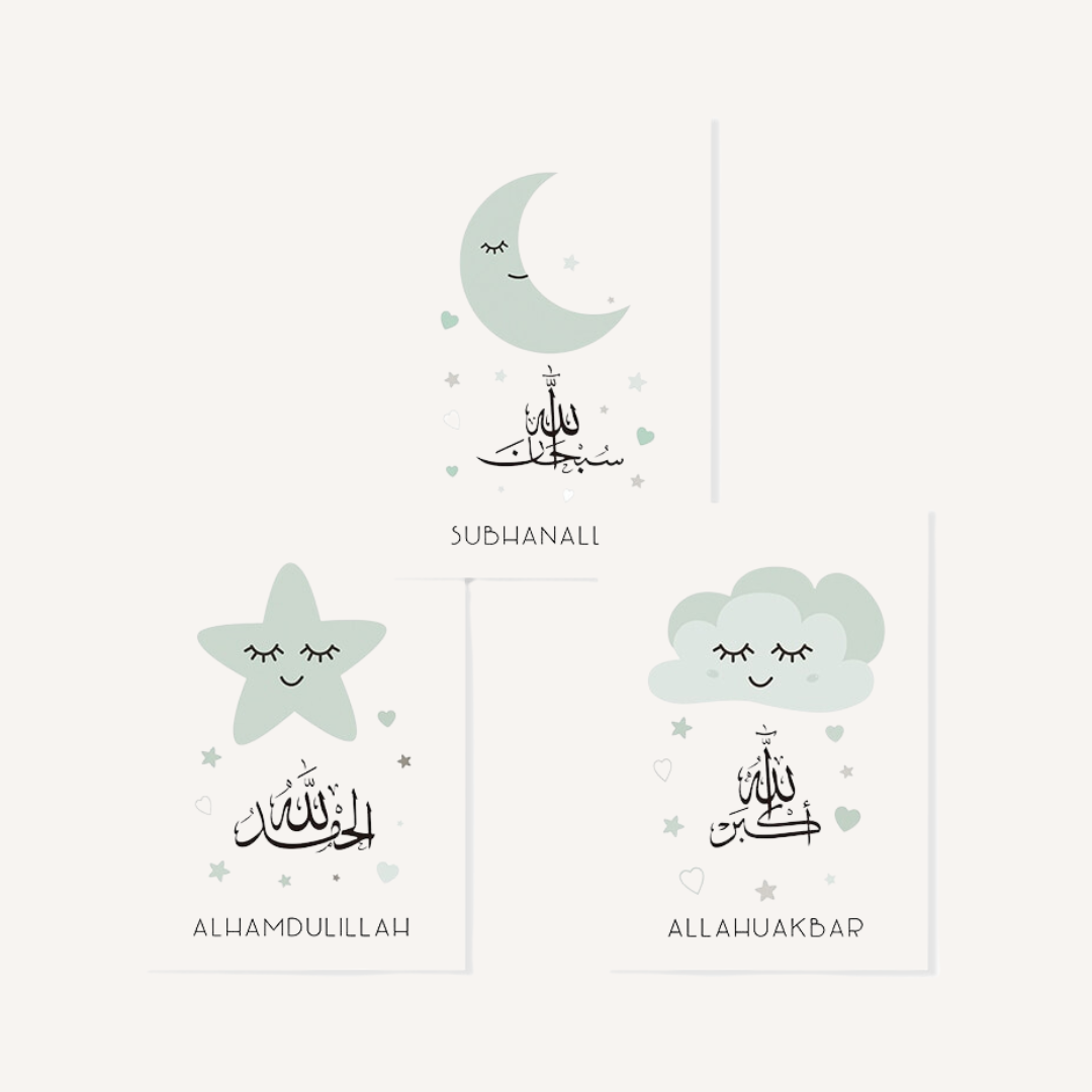 Une affiche avec écriture calligraphique "Al hamdu lillah ", "Suban Allah " & "Allahu Akbar" ♥️