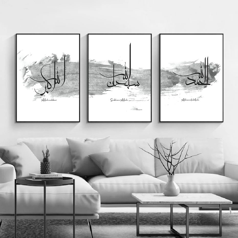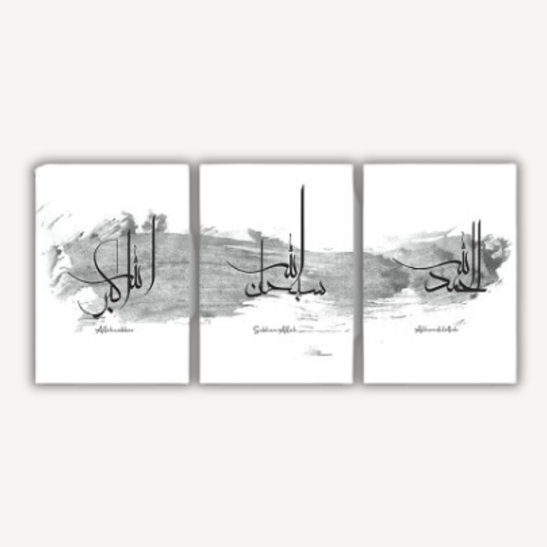Une affiche avec écriture calligraphique "Al hamdu lillah ", "Suban Allah " & "Allahu Akbar" ♥️